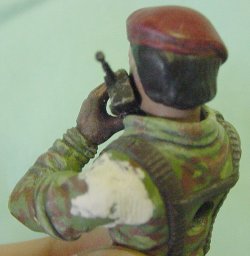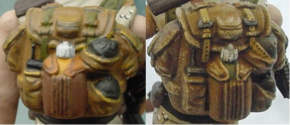 I hope this section has clarified some of my techniques. Once again, when I have my own digital camera I will illustrate this section much more fully. I am always happy to give more advice/clarification/encouragement if you email me at McGhiever@yahoo.com. Everything I've learned about figure modelling and painting is from hobby books, magazines, and websites. There's plenty of information out there, and although none of it applies specifically to G.I. Joes, the techniques are the same. Finally, keep trying; you'll improve with every piece. I repainted Desert Storm's backpack just one year after my first attempt, and just look at the difference: