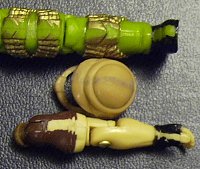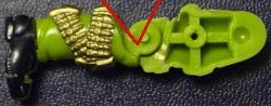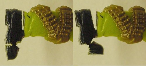 If you can pose the figure to your satisfaction already, go ahead and skip down to the paragraphs on filling in the joints. For more elaborate poses, it can be necessary to make cuts with a hobby saw and reposition ankles, hips, etc. This was done extensively with Firefly and also to Snow Serpent's neck and ankles. For joints that will be only slightly opened, one simple cut will do, as you can see here on Salvo's ankle. For greater angles, though, such as at Salvo's toes, it is necessary to make a notch on the other side as well or he'll have an abnormally long foot. Once the cuts have been made, hold the body part over a candle until the plastic gets soft enough to bend gently. Don't let it melt! That's really hard to fix. As soon as you have the joint positioned to your liking, dunk the piece in water to cool it in shape.| Flexing the knee is even easier. Here you can see the wedge I've cut out. When the leg is reassembled and bent, it will make an acute angle instead of bending at exactly 90 degrees. This is crucial in making a realistic kneeling pose. | ![]() |