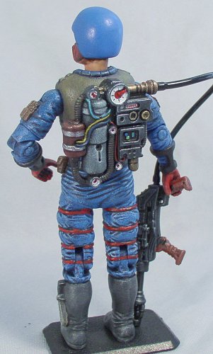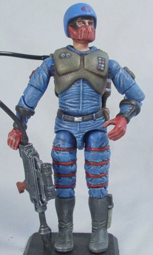 Figure & Equipment: Laser Viper ('01) Another straight-up repaint, though I made the vest a leather colour to reduce the amount of red on the figure (too easy a target, otherwise). I chose this figure because the extremely foldy clothes just looked like too much fun to drybrush. One detail I'd never noticed until I began painting this figure was that Laser Viper's head is moulded with the lines of a balaclava under his helmet and facemask. |