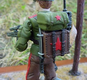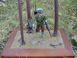 Groundwork: This was my first diorama and I wasn’t up to creating realistic plants in such a large scale. Pine forests have the wonderful characteristic of not having any undergrowth, and they seem like a reasonable environment for a Russian soldier. The sticks, from my girlfriend’s backyard in Maryland, were a key find. Whatever plant it was, the branches grew in a whorl pattern, so, turned upside-down, they look like roots at ground level. The pine needles were a huge hassle, and I gave up before producing as many as I wanted. In a real pine forest the needles are so thick you can’t see the ground. I hope to do another pine forest scene once I come up with a better way than painting Woodland Scenics field grass and trying to cut the resulting mass into tiny lengths. |