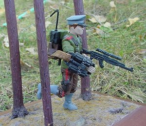 Physical modifications: I filed off all the moulding lines and copyright embossing and filled in the waist area with Sculpey. This was my first Joe scale model, and I didn’t fill in any of the other joints like I have since. I will never use Sculpey again, even though it’s a lot easier to shape than modelling putty, because it always stays pliable (and therefore damageable). Secondly, the paint over it always has an oily sheen. For the weapons I drilled barrel holes. I also cut the ends off the ammo strip so it didn’t look as fake. Initially I wanted to scratchbuild a completely new strip, but I couldn’t figure out how to make one. |