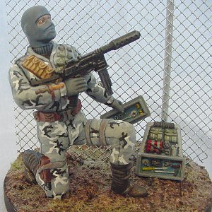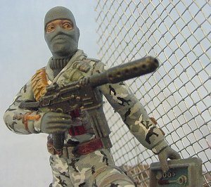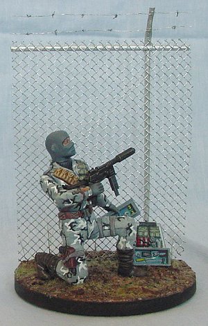Painting: “Urban camouflage” is a creation of fashion designers, but if anyone has a legitimate military purpose for it it would have to be Firefly. Unfortunately the pattern isn’t as dense as it should be; Livevil still has me beat hands down when it comes to painting camouflage. Since the comic book continuity indicates that Firefly hails from Southeast Asia, I gave what little skin he shows the appropriate tone. Bringing out the detail on his backpack was extremely satisfying; in fact, displaying it was the reason for the pose. |
